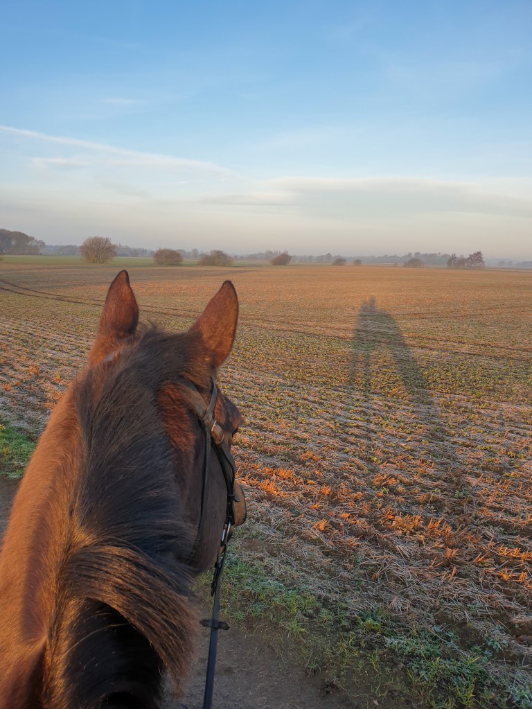 Continuing on I smile to myself on this stunning morning, forgetting about all the work and life admin that needs doing and just enjoy the icy-cold air on my face and rays of sunshine across the fields ahead. We haven’t hacked in almost a week and Mocca is surprisingly relaxed, despite our rocky start. I think about taking the short route and heading back to school her but decide to take advantage of the wind-free day and venture on further. As we get to the ditch, a possible turning point for home, Mocca becomes jolly and I know I’ve got my hands full; this is where the fun begins. At the end of the track she is determined to continue on to home so, being about as stubborn as Mocca, I turn her left up towards the woods. Ha! That slows her down!